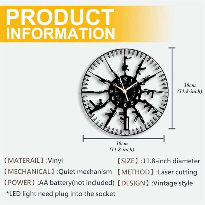 - 【Firearms Wall Clock】 - The clock is 11.81 inches and the dial is 4.13 inches (please note that the dial is a sticker). The clock is controlled by 1AA battery (battery is not included in the package)