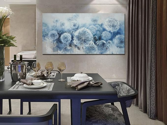 Arjun Flower Wall Art Indigo Blue Dandelion Floral Canvas Painting Watercolor White Textured Modern Artwork Large Framed for Living Room Bedroom Dinning Room Bathroom Home Office Wall Decor, 48"x24"