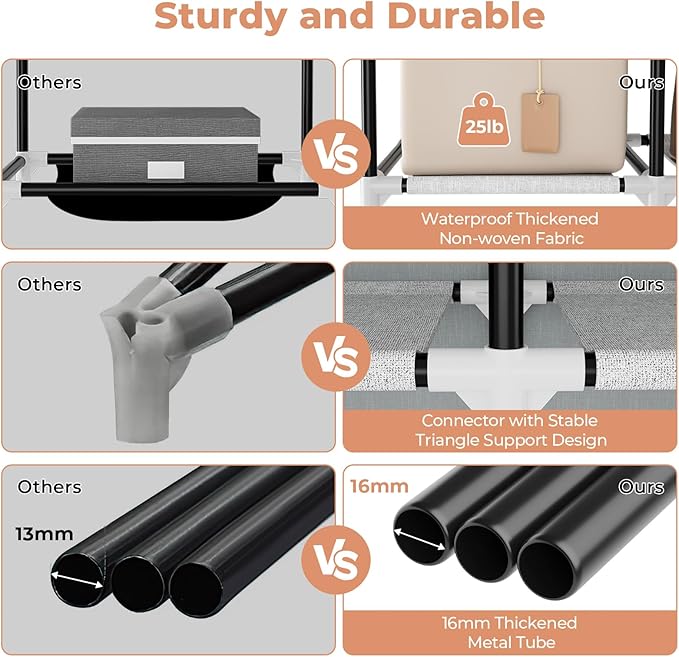 - [Sturdy and Durable Construction] Closet storage organizer is made of thickened metal tube, waterproof non-woven cover and reinforced PP plastic connectors. Provides superb weight capacity, sturdy, and durable. Meet your long-term storage needs.