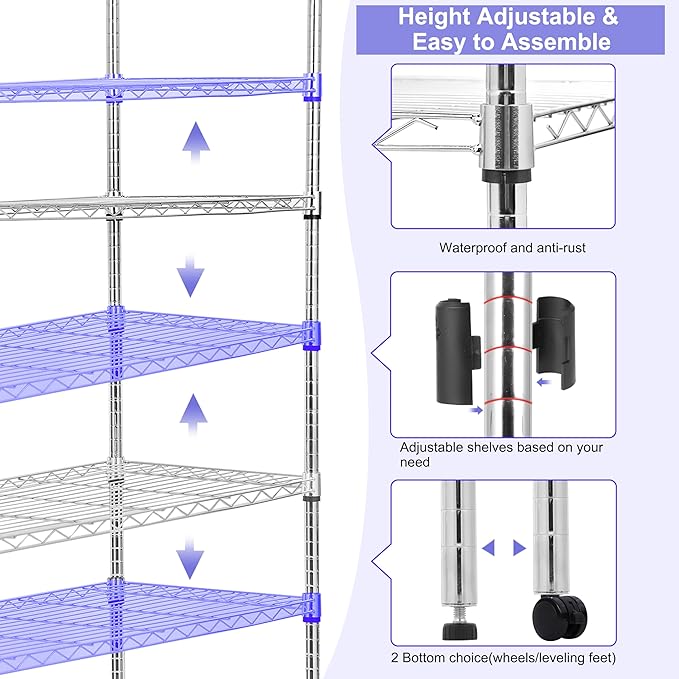 - High Weight Capacity: Constructed from sturdy metal materials, Wire Shelvingboasts excellent durability, Each shelf has a capacity of up to 400 lbs, with a maximum weight capacity of 1600 lbs total, capable of supporting weightover extended periods, ensuring your items are safely and neatly stored.