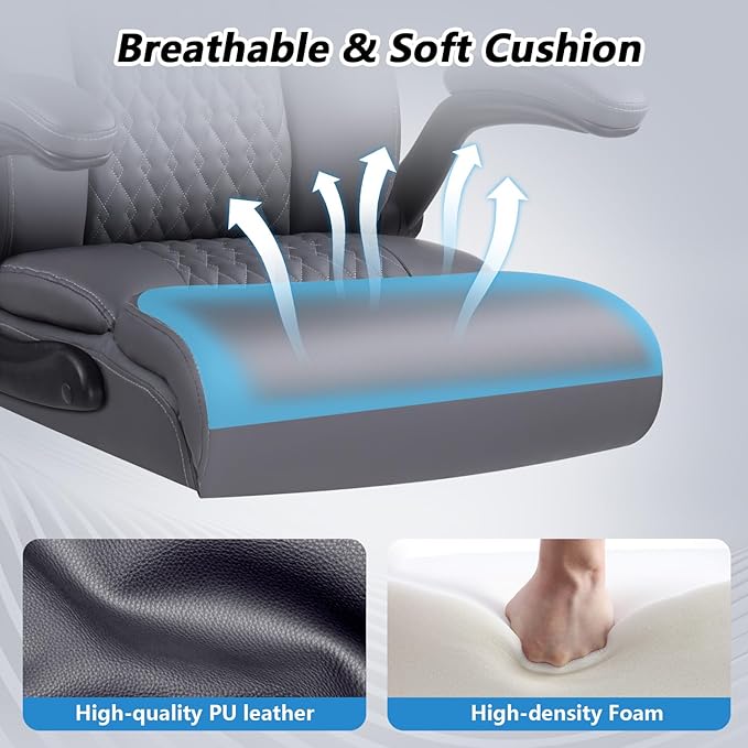 - 【Quality Office Chair for All-Day Support】 The seat cushion of this grey wide desk chair are padded with high-density foam. The surface of this high back ergonomic desk chair is made of high-quality leather, which is waterproof, skin-friendly, and easy to clean. This executive office chair with lumbar support helps improve work and study efficiency.