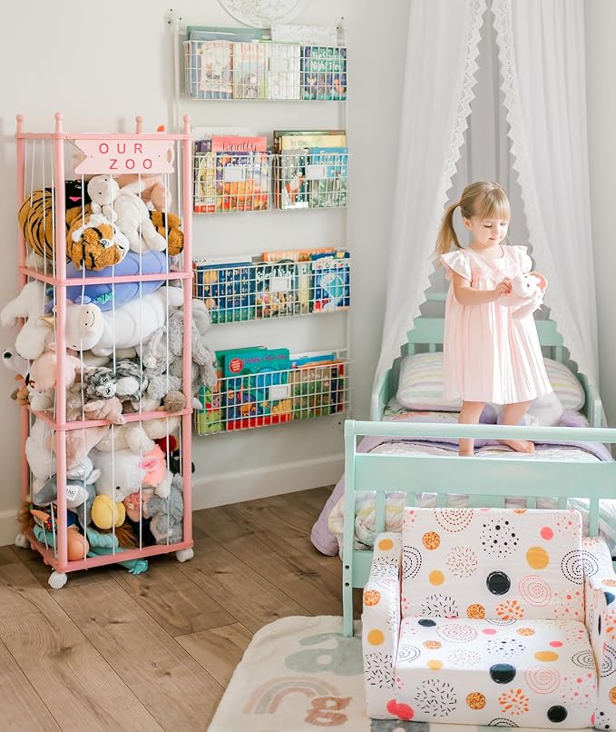 - Space-Saving Stuffed Animal Organizer: Maximize floor space with our tall, narrow design. The stuffed animal storage system uses elastic cords to hold toys securely, freeing up room for play without sacrificing style
