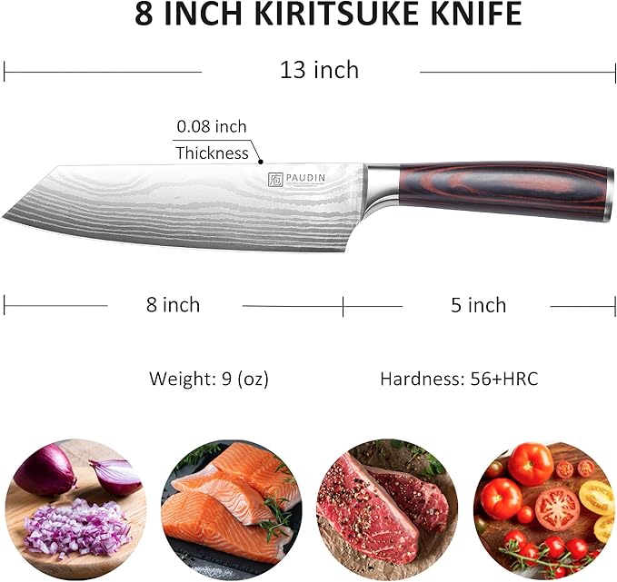 - ULTRA SHARP KNIFE: The PAUDIN Kitchen Knife is made of 5Cr15MoV high-carbon stainless steel, ensuring excellent durability, corrosion resistance, and finish, can be used for many years. The blade is only 2 mm thick, the edge is hand-polished, making the blade extremely sharp, making each cutting experience a pleasure