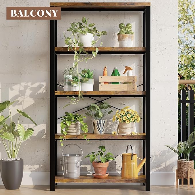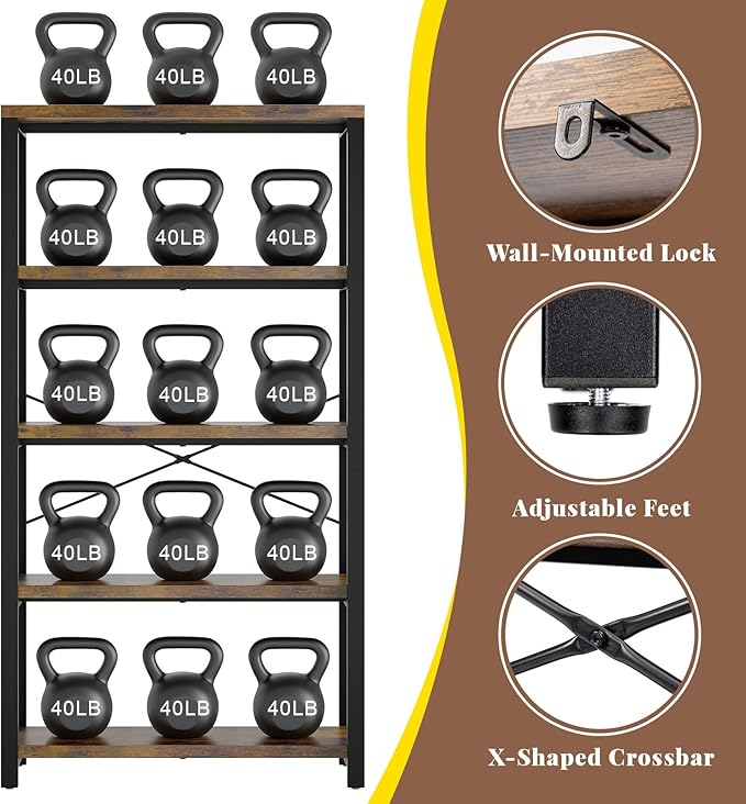 5-Tier Adjustable Heavy Duty Bookshelf, Industrial Wooden Open Storage Rack with Black Metal Frame, Vintage Bookcase with Lock Wall Design, Rustic Brown
