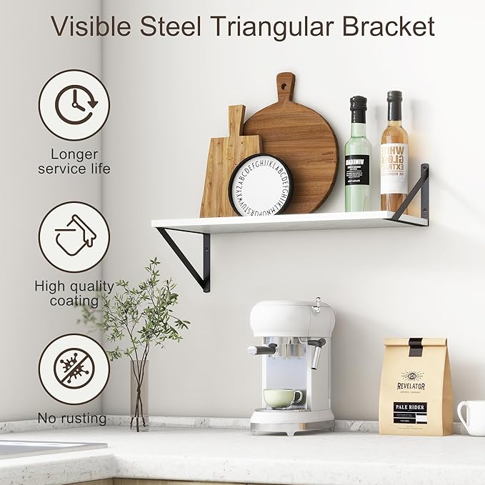 - 【FARMHOUSE RUSTIC WALL SHELF】These floating shelves are made of premium engineered wood board and visible triangular bracket. The rustic wooden grain surface add character and warmth to any modern or traditional interior with these deep floating shelves, contrast shelves at staggering heights on the wall or mount side-by-side or in the corner for a clean streamlined look.