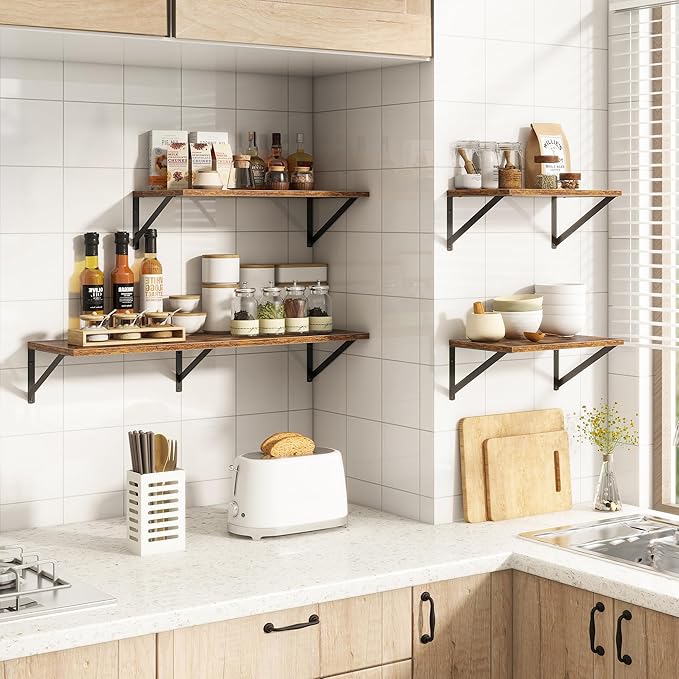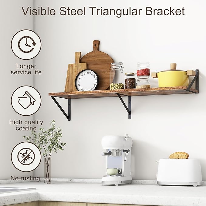 - 【FARMHOUSE RUSTIC WALL SHELF】These floating shelves are made of premium engineered wood board and visible triangular bracket. The rustic wooden grain surface add character and warmth to any modern or traditional interior with these deep floating shelves, contrast shelves at staggering heights on the wall or mount side-by-side or in the corner for a clean streamlined look.