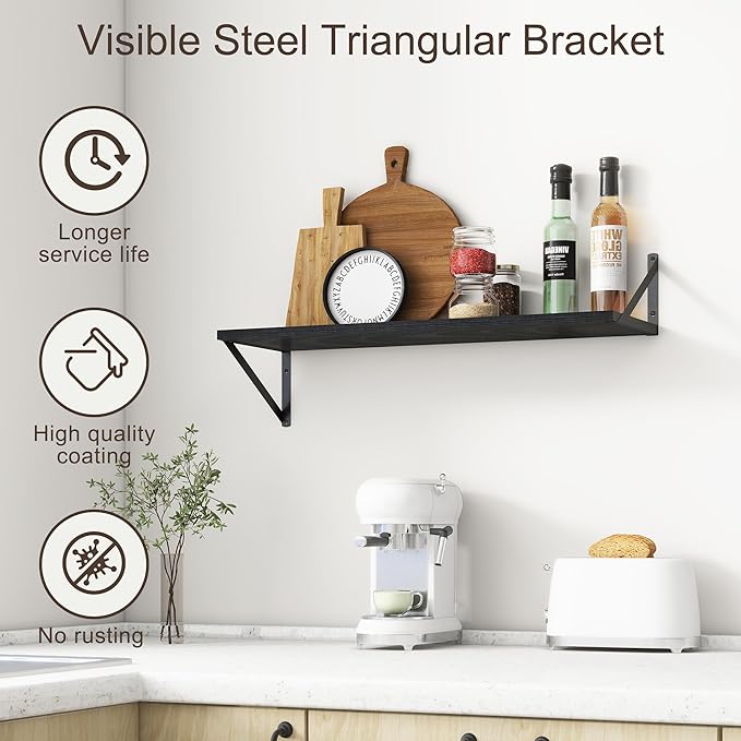 - 【FARMHOUSE RUSTIC WALL SHELF】These floating shelves are made of premium engineered wood board and visible triangular bracket. The rustic wooden grain surface add character and warmth to any modern or traditional interior with these deep floating shelves, contrast shelves at staggering heights on the wall or mount side-by-side or in the corner for a clean streamlined look.