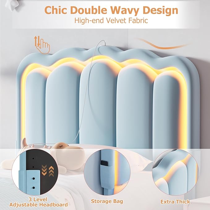 - CHARMING ADJUSTABLE HEADBOARD DESIGN: This twin bed frame with double wavy headboard that combines elegance with whimsy. Upholstered in skin-friendly, soft sponge-padded material and wrapped in luxurious velvet fabric, this velvet bed frame offers exceptional comfort and visual appeal. The adjustable headboard height easily fits different mattress thicknesses, giving your child the support they need while reading or watching TV in bed. A charming blend of classic style and modern design for any girl's room