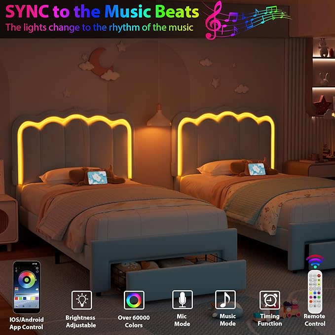 - SMART RGB LIGHTS WITH MUSIC SYNC: This twin bed frame for kids with built-in RGB LED headboard transforms your bedroom with over 16 million colors, 20+ light effects, and dynamic modes controlled by app or remote. Bold lights sync with music, setting the ideal vibe for relaxing, reading, or entertaining. From gentle nightlight for kids to vivid party colors, this velvet bed frame makes every moment magical with immersive ambiance