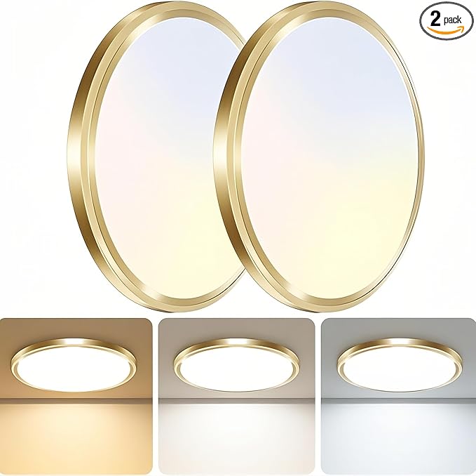zemty 2Pack LED Ceiling Light Fixture, 6.5-Inch 12W 1200lm Small Flush Mount Light, Adjustable 3000K 4000K 6500K Color Temperatures, Round Flat Recessed Lamp for Kitchen Closet Hallway Laundry, Gold