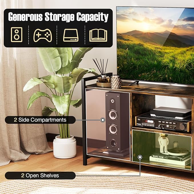 - Practical Storage Solutions: Keep your audio speakers and other large equipment neatly tucked away in the 2 spacious side compartments. And for all your gaming consoles, DVDs, and remotes, the 2 middle shelves offer a perfect home, keeping your media area organized and clutter-free.