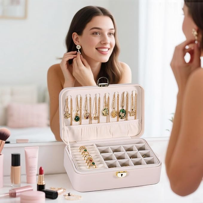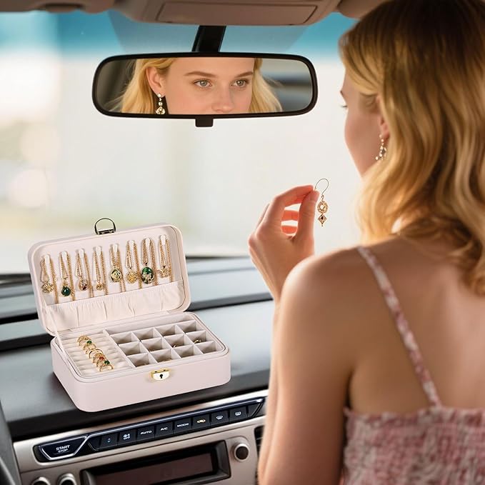 Travel Jewelry Case With Lock, 2-Layer PU Leather Jewelry Box for Women, Ring Box and Jewelry Organizer, Large Jewelry Travel Case,Best Gifts for Women for the Holidays(White)