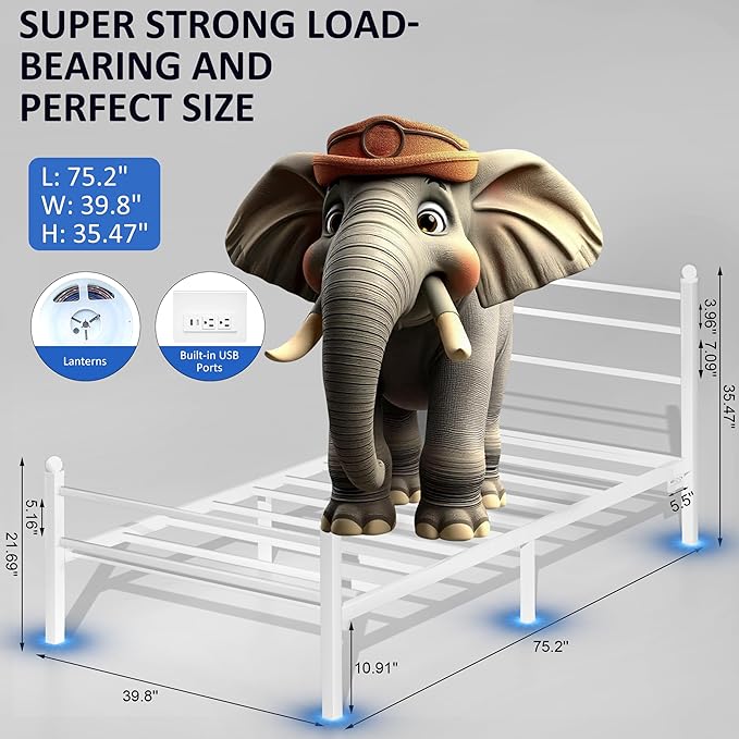 Twin Bed Frame with LED Lights & Charging Station, Metal Platform Bed with Headboard, Heavy Duty Metal Slats, No Box Spring Needed, Noise Free, Easy Assembly, White