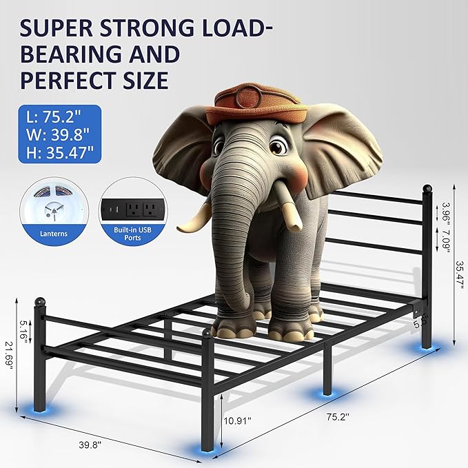 Twin Bed Frame with LED Lights & Charging Station, Metal Platform Bed with Headboard, Heavy Duty Metal Slats, No Box Spring Needed, Noise Free, Easy Assembly, Black