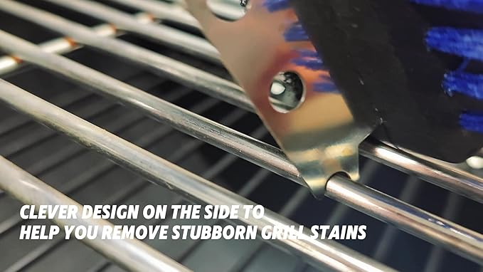 - Cleaning performance: Stiff nylon bristles remove stuck-on food particles; Angled brush head reaches between grill grates; Scraper tackles burned-on grease; Complete cleaning in fewer passes