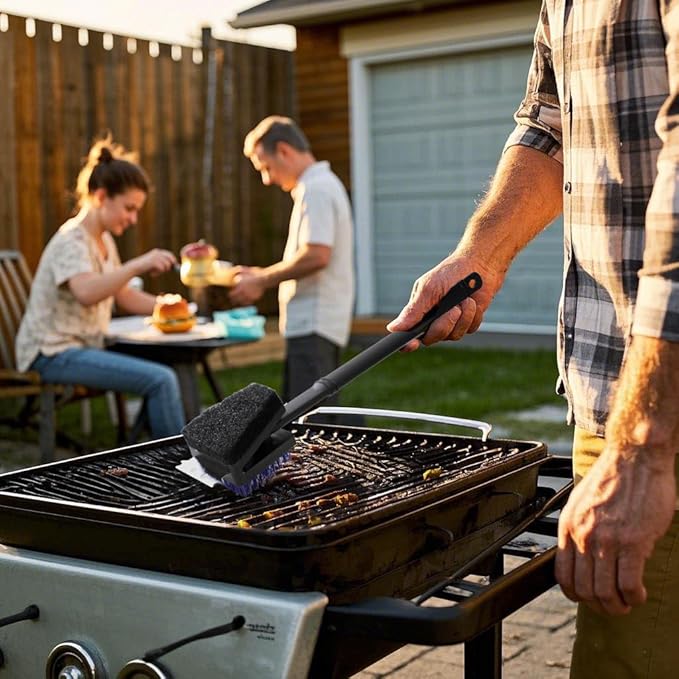 - Construction and materials: Heavy-duty nylon bristles designed for effective cleaning without scratching; Stainless steel scraper attachment for tough residue; 15 inch plastic handle provides safe distance from heat; Reinforced brush head prevents bristle loss