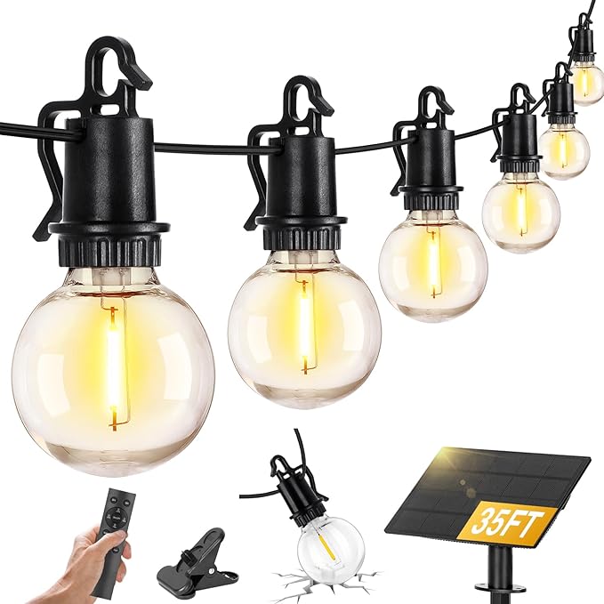 - 【Solar Powered & USB Charging】Equipped with high-efficient solar panels, these G40 solar string lights are very eco-friendly, can auto convert sunlight into electrical energy at daytime, will be fully charged after 6-8 hours’ exposure to the sunlight, then gives off impressive lighting effects for about 8 hours at night. Even on rainy or cloudy day, you’ll never worry about dim brightness for lack of sunlight, our G40 lights are designed with a USB charging port to ensure normal work.