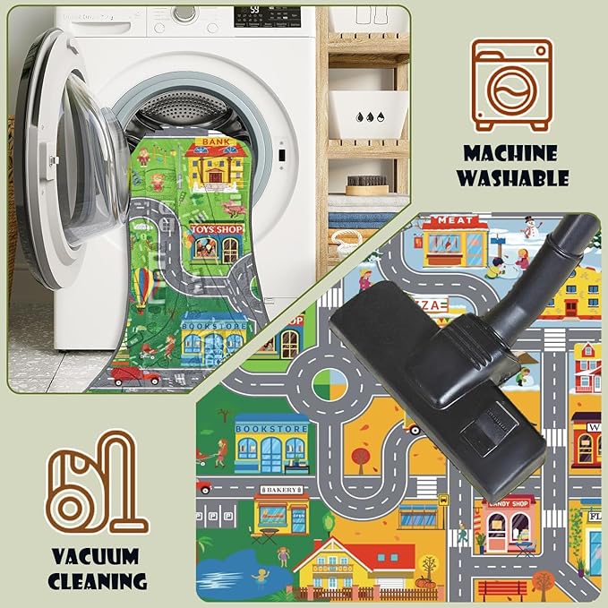 - SEASONAL CITY MAP DESIGN: This rug features a vibrant city map that spans across four seasons—spring, summer, autumn, and winter. With colorful houses, parks, schools, shops, and detailed seasonal scenes, from blooming flowers to snowy streets, this rug offers an immersive play experience full of imagination and adventure.