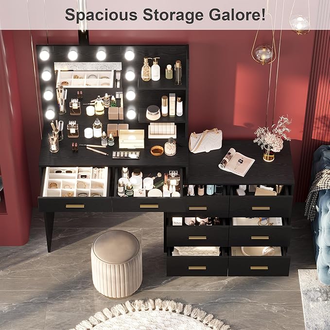 - 【Powerful Storage Capacity】Tired of rummaging through cluttered makeup bags? Our makeup vanity desk with lights is here to help you! With two open shelves and eight spacious storage drawers, you'll have ample room for all your cosmetics, skincare, and beauty tools. Picture yourself effortlessly finding your favorite lipstick or that perfect palette on a busy morning, making your routine smooth and enjoyable.