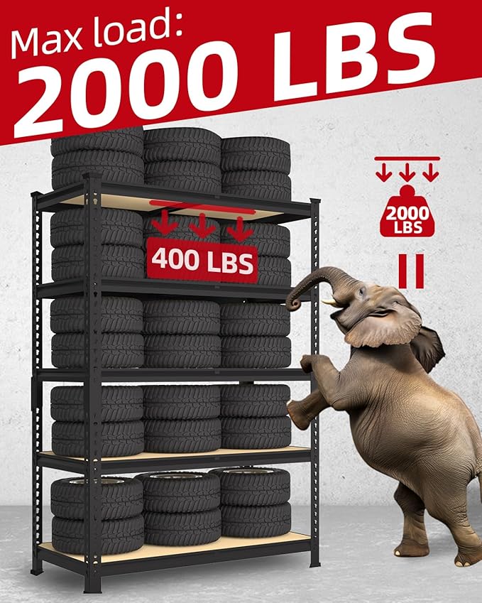 - 【Heavy Duty Garage Shelving Unit】The 5-tier heavy duty garage storage shelving unit is constructed from FSC-Certified high-quality thick MDF boards and a heavy-duty metal frame with a premium powder-coated finish surface. Each shelf layer is equipped with 1 middle support beam. It's not only sturdy and long-lasting, but also ensures the shelf maintains its appearance and performance in various environments. Each shelf holds up to 400 lbs, 5 tier shelves' total max load weight is 2000 lbs