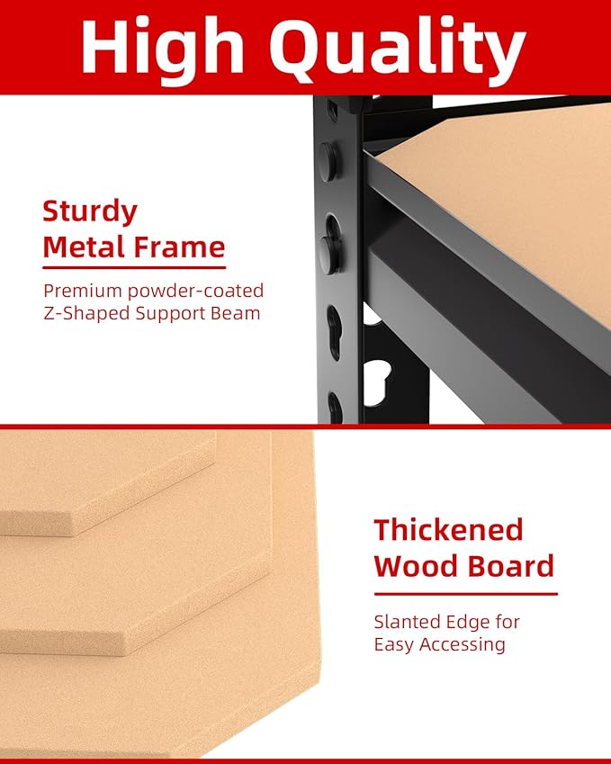 - 【Heavy Duty Garage Shelving Unit】The 5-tier heavy duty garage storage shelving unit is constructed from FSC-Certified high-quality thick MDF boards and a heavy-duty metal frame with a premium powder-coated finish surface. Each shelf layer is equipped with 1 middle support beam. It's not only sturdy and long-lasting, but also ensures the shelf maintains its appearance and performance in various environments. Each shelf holds up to 400 lbs, 5 tier shelves' total max load weight is 2000 lbs