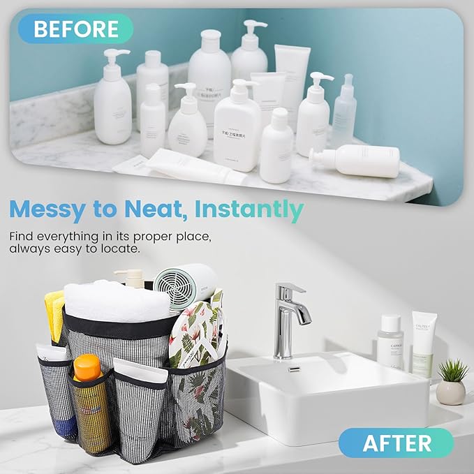 - Larger Capacity with 9 Pockets:The spacious mesh shower caddy gets 1 large center pocket and 8 side pockets to store all the essentials. A middle pocket fits larger items like shampoo, towels, and hair dryers, while side pockets fit smaller items like toothbrushes, facial cleansers, and razors.