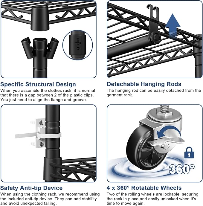 - ▶【PORTABLE & LOCKABLE】Our rolling clothes rack comes with four 360° rotation wheels ,You can take portable clothes rack anywhere you need it,Such as bedroom, laundry room, living room, cloakroom, hallway, clothes store etc,Two of the wheels have locking function,Coupled with the Anti-tip Device to enhance the stability of the portable closet,You will get a flexible closet organizer and storage system,Can be mobile or fixed!