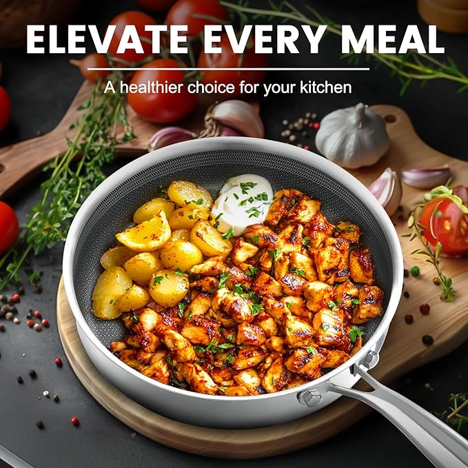- 【Multi-Layered Performance Design】 Engineered with 4 premium layers, this skillet combines a honeycombed nonstick coating with 304 stainless steel durability. An aluminum diffusion layer ensures rapid heat distribution, while the 430 stainless steel base provides stability across all cooktops—a cooking pan built for precision temperature control