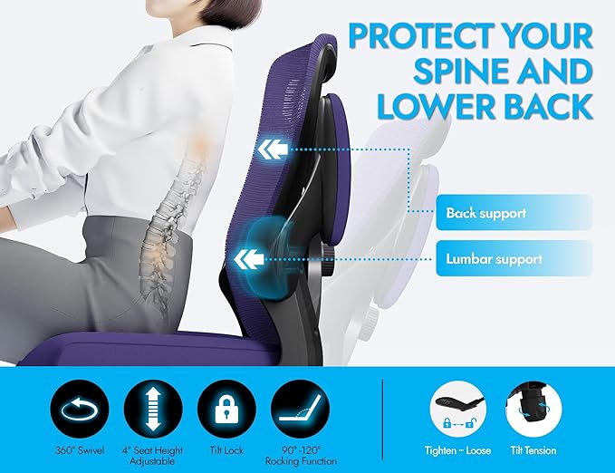 Ergonomic Office Chair - X-Shaped Computer Desk Chair Comfy, Gaming Chair, Office Chair with Lumbar Support, Mesh Office Chairs, Desk Chair for Long Hours(Black Purple)