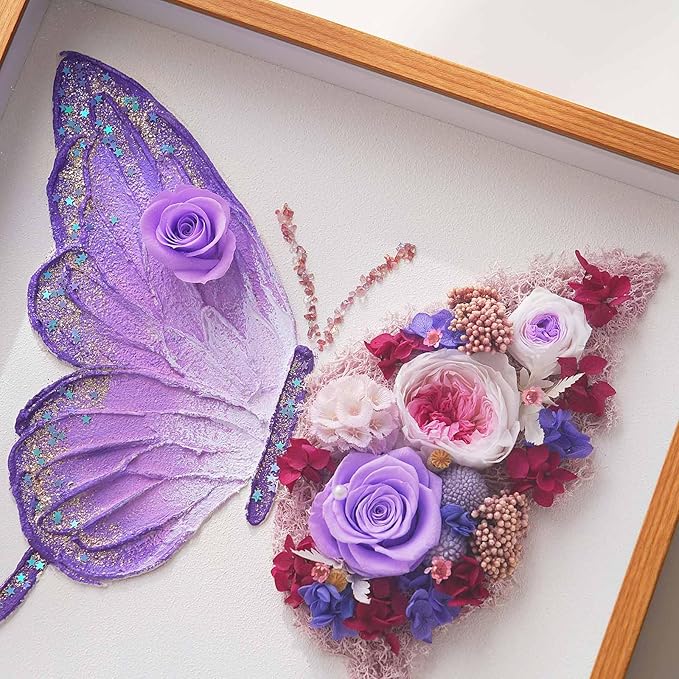 - Preserved Real Roses for Eternal Beauty – One butterfly wing is delicately adorned with preserved roses that last for years without fading, symbolizing eternal love and romance. More special than fresh flowers, this artwork combines nature with timeless beauty.