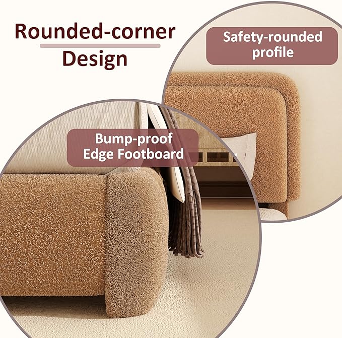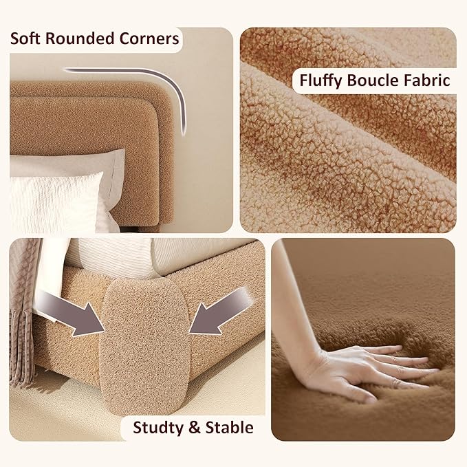 Queen Boucle Platform Bed Frame with Height Adjustable Headboard, Modern Upholstered Cloud Bed, Sleek Curved Design, No Box Spring Needed, Easy Assembly, Noise Free, Camel