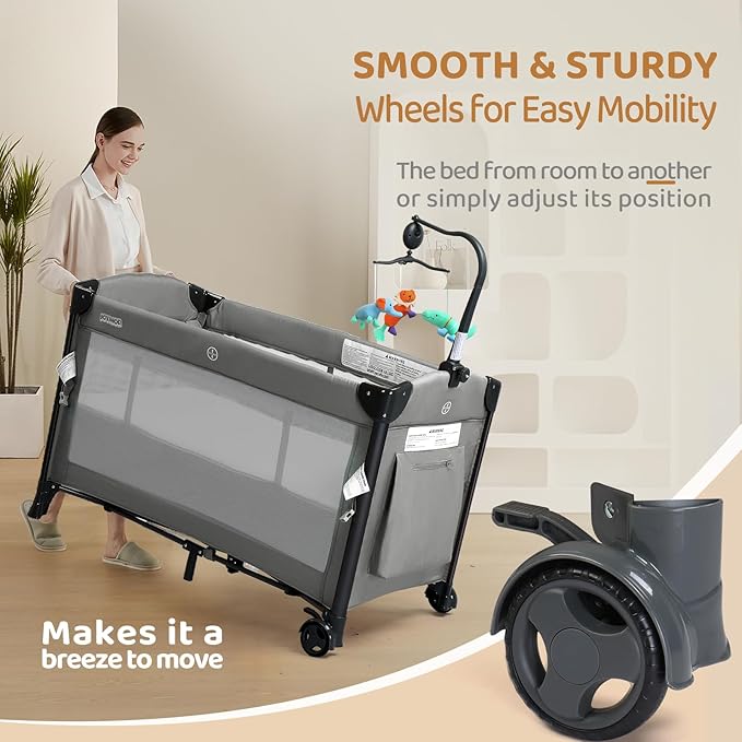 JOYMOR Baby Bassinet, Pack and Play with Bassinet and Carry Bag, Convert to Bedside Sleeper with Toy, Wheels for Boys Girls (Gray)