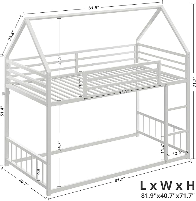 - Dimension: measuring 81.9"L x 40.7"W x 71.7"H, our low bunk bed features a longer length that gives you a better sleeping experience.