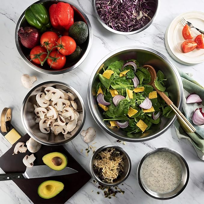 Stainless Steel Mixing Bowl Set, Nesting Bowls for Kitchen Baking, Cooking, Prepping, Kitchen Food Storage Organizers, No Lids (6 Pack)