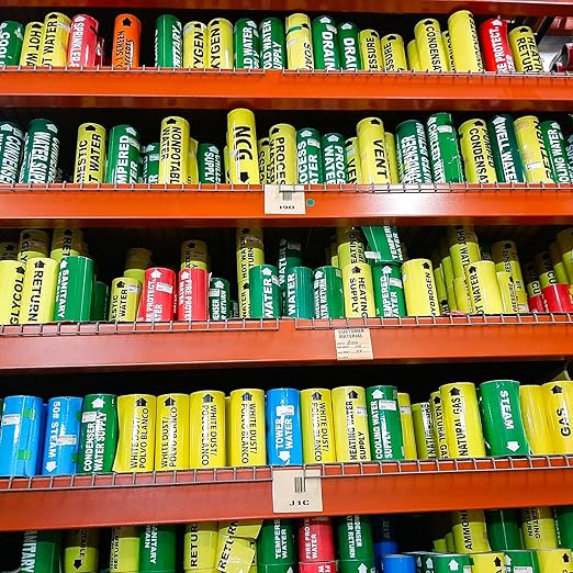 - IDENTIFICATION: High-visibility yellow pipe markers with bold black text for clear labeling of industrial piping systems