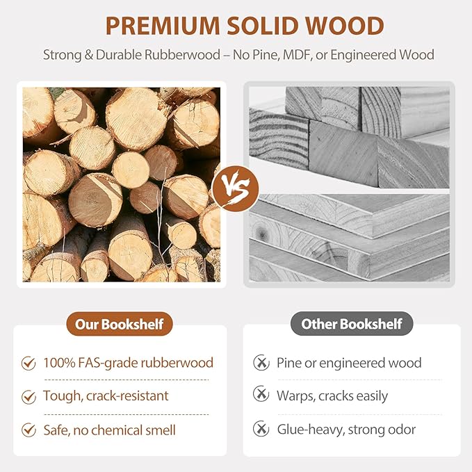 - 【PREMIUM SOLID WOOD】Made from 100% FAS-grade rubberwood, this round rotating bookshelf delivers strong, stable, and lasting performance compared to MDF or engineered wood commonly used by competitors