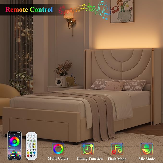 HITHOS Twin Upholstered LED Bed Frame with Storage Drawer, Velvet Kids Bed with Wingback Headboard, Princess Twin Platform Bed for Girls/Kids, Solid Wood Slats Support, No Box Spring Needed, Beige