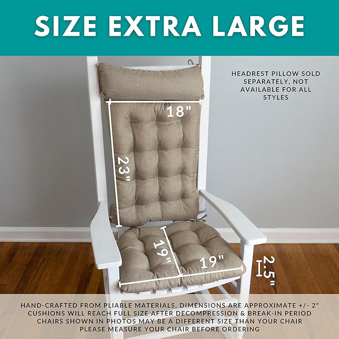 - Extra Large Rocking Chair Cushions: The set includes one seat cushion (19.5"D x 19"W x 2.5"H) with two ties and one backrest cushion (18"W x 23"L) with four ties, chair not included; fits many brands of outdoor rocking chairs, some indoor rockers, and some gliders; Please measure your chair before ordering