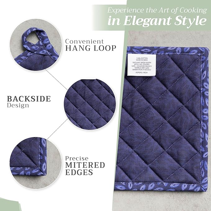 - Premium Quality: Crafted from quilted 100% cotton, this heat-resistant pot holder set protects your hands from hot cookware. Each piece features a built-in hanging loop for easy storage and quick access. Perfect for everyday home kitchens, farmhouse kitchens, hotels, restaurants, and bakeries