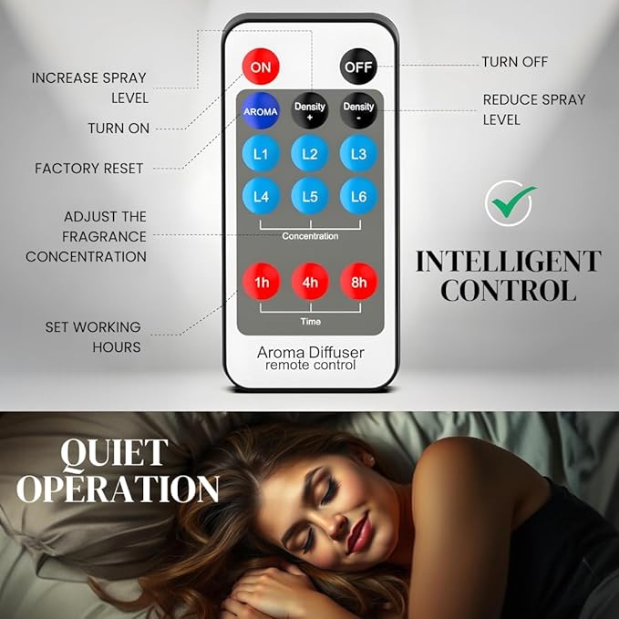- Enjoy a quiet, customizable scent experience with the Luxscent Aroma Diffuser. Covering up to 1000sq. ft., it features remote control, continuous mode, and a programmable timer (1, 4, or 8 hours) for effortless aroma control in any space.