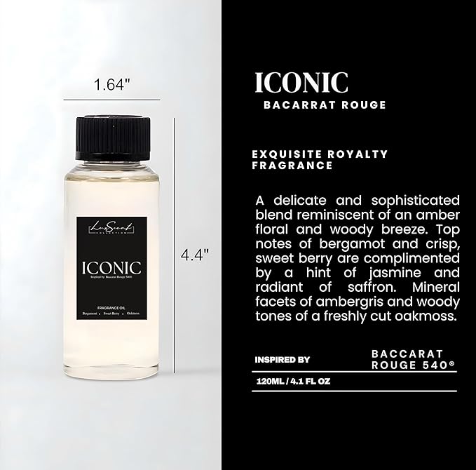 - ICONIC Inspired by: BACCARAT ROUGE | A delicate and sophisticated blend reminiscent of an amber floral and woody breeze. Top notes of bergamot and crisp, sweet berry are complimented by a hint of jasmine and radiant of saffron. Mineral facets of ambergris and woody tones of a freshly cut oakmoss make this a scent fit for royalty.