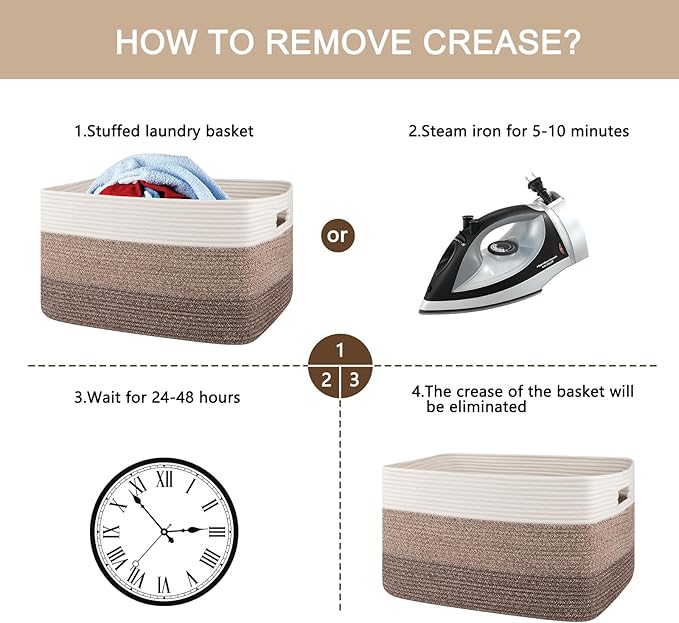- Washable Large Basket: This large basket can be washed by hand or machine with gentle detergent. If machine washed, please put them into a laundry bag. NOTE: These cotton rope baskets are folded when shipping, but it will turn back to its elegant shape quickly if you fill it with some towels or clothing, and iron is great idea to remove the creases