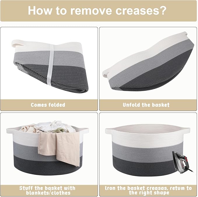 - Washable Large Basket: This big basket can be washed by hand or machine with gentle detergent. If machine washed, please put them into a laundry bag. NOTE: These cotton rope baskets are folded when shipping, but it will turn back to its elegant shape quickly if you fill it with some towels or clothing, and iron is great idea to remove the creases