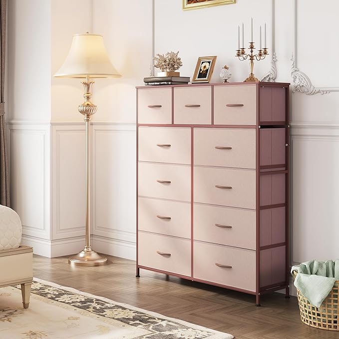 WLIVE Storage Organizer Unit with 11 Fabric Bins, Storage Drawers Organizer with Steel Frame, Tall Storage Tower Organizaton for Living Room, Hallway, Office, Office, Pink