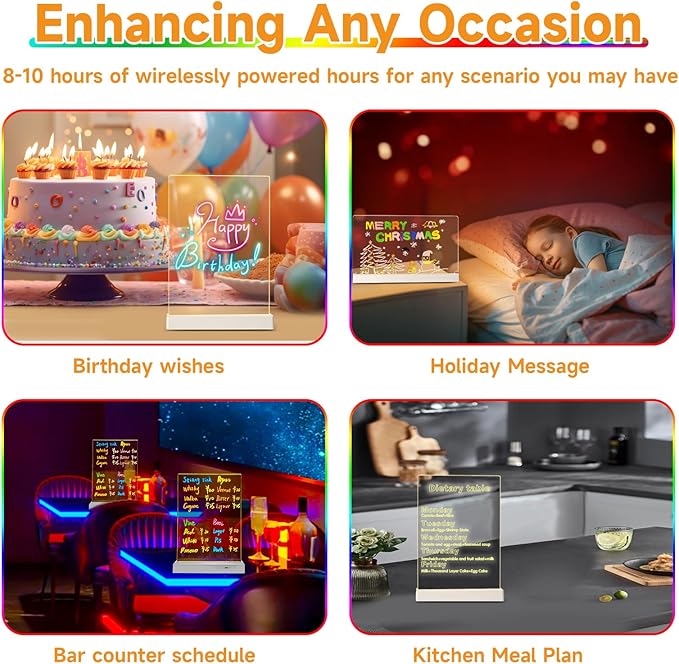 - 【Ideal Gift for Every Occasion】 - Want a unique and practical gift? Our LED acrylic dry erase board makes a thoughtful gift for birthdays, Christmas, anniversaries, housewarming or any special occasion. Express your love for your child or partner with sweet words or drawings.