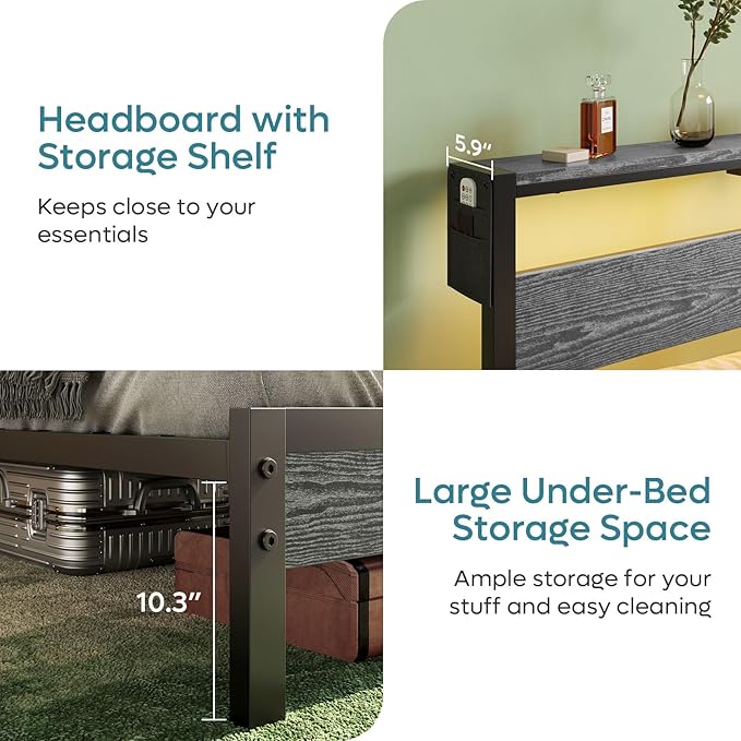 - 【Headboard Storage Shelf & Under-Bed Storage】 The LED Platform Bed Frame offer a convenient storage solution, keeping essentials within easy reach and providing an additional space for decorating your home. The 10.3-inch under-bed space is perfect for storing luggage and easy to clean