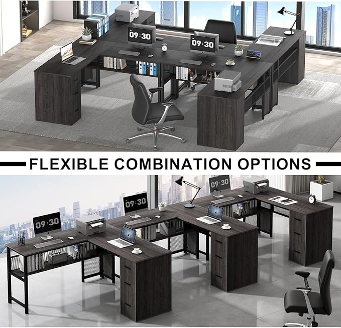 - Sturdy and Durable Construction: This wooden executive computer desk combines dark gray oak solid premium engineered wood panels with robust iron components. It's built to last, with every detail showing high-quality craftsmanship. The grey L-shaped design, featuring an industrial-style look with the combination of mesh and wood panels, gives it a unique and appealing appearance
