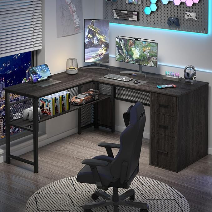 - L-shaped Desk with Versatile Features: This Gray L shaped desk, sized at 59.1"/55.1" W x 19.7"/15.7" D x 30.0" H, is a multi-functional piece. It can hold computers, monitors, and keyboards effortlessly. Plus, it offers plenty of space for organizing files, writing, and drawing. The Grey L shape desk comes with three drawers - two medium ones for office supplies and small items, and one large one for file folders. Underneath, there's an open shelf for quick access to frequently used stuff, ensuring efficient office supply management