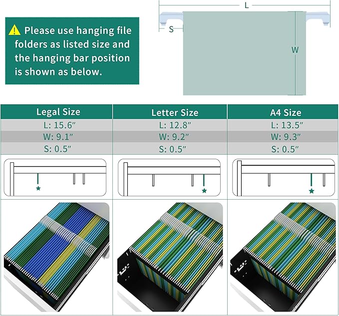 - Exceptional Storage Capacity: Maximize organization with our 3-drawer file cabinet; The bottom drawer is designed for A4, letter, and legal files, while the hanging rods are adjustable for your versatile storage requirements
