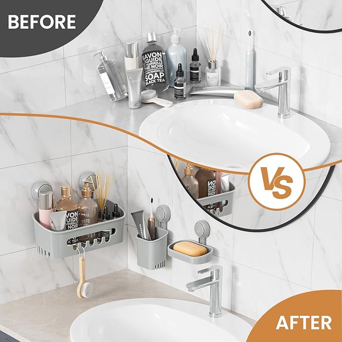 LEVERLOC Shower Caddy Suction Cup Set Shower Organizer & Soap Holder & Toothbrush Holder, Bathroom Shelf Basket NO-Drilling, Removable Suction Storage Waterproof Bathroom Caddy, Gray